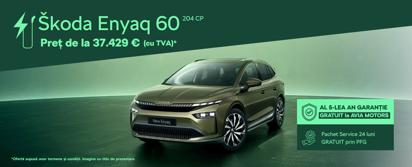 *Oferta de preț este calculată pentru Škoda Enyaq 60 204 CP. Prețul final de vânzare este 37.429 € cu TVA (187.145 Lei) ce include Avantaj Client în valoare de 2.745 €, Discount Avia Motors în valoare de 1.423 € și Bonus PFG în valoare de 2.449 €, în conformitate cu condițiile campaniei Porsche Finance Group Romania. Prezenta ofertă este cu titlu informativ, iar informațiile oferite referitoare la prețuri, dotări standard și opționale corespund momentului actual. Oferta este valabilă la Avia Motors Pantelimon până la 31.03.2026.