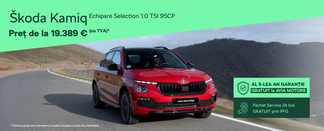 *Oferta se referă la modelul Škoda Kamiq Selection 1.0 TSI 95 CP. Prețul final de vânzare este 19.389 € cu TVA (96.945 Lei) ce include Discount Avia Motors în valoare de 813 € și Bonus PFG în valoare de 1599 €, în conformitate cu condițiile campaniei Porsche Finance Group Romania. Prezenta ofertă este cu titlu informativ, iar informațiile oferite referitoare la prețuri, dotări standard și opționale corespund momentului actual. Oferta este valabilă la Avia Motors Pantelimon până la 31.03.2026.