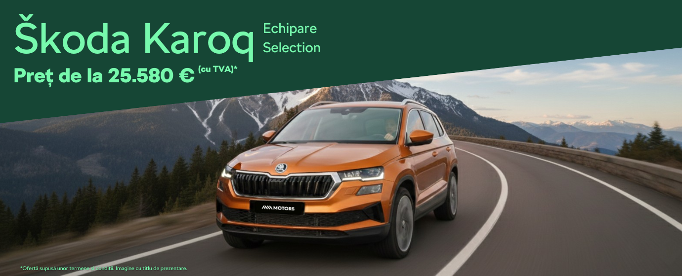 *Oferta de preț este calculată pentru Škoda Karoq Selection 1.5 TSI DSG 150 CP. Prețul final de vânzare este 25.580 € cu TVA (127.900 Lei), include Avantaj Client în valoare de 3.750 €, Discount Avia Motors în valoare de 1.157 € și Bonus PFG în valoare de 2.198 €, în conformitate cu condițiile campaniei Porsche Finance Group Romania. Prezenta ofertă este cu titlu informativ, iar informațiile oferite referitoare la prețuri, dotări standard și opționale corespund momentului actual. Oferta este valabilă la Avia Motors Pantelimon până la 31.03.2026.